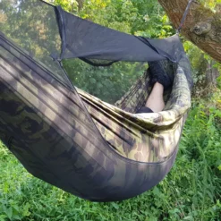 Når du forbereder din plads til hængekøjen, er det mest bekvemt først at lægge din tildækkede rygsæk ned i hængekøjen. Træk derefter det justerbare ophængningssystem ud af lommerne i overtrækkets hjørner og klips dem fast i hængekøjens karabiner. Til sidst skal du bare lægge rygsækken ned under hængekøjen og justere ophængningshøjden, hvis det er nødvendigt.