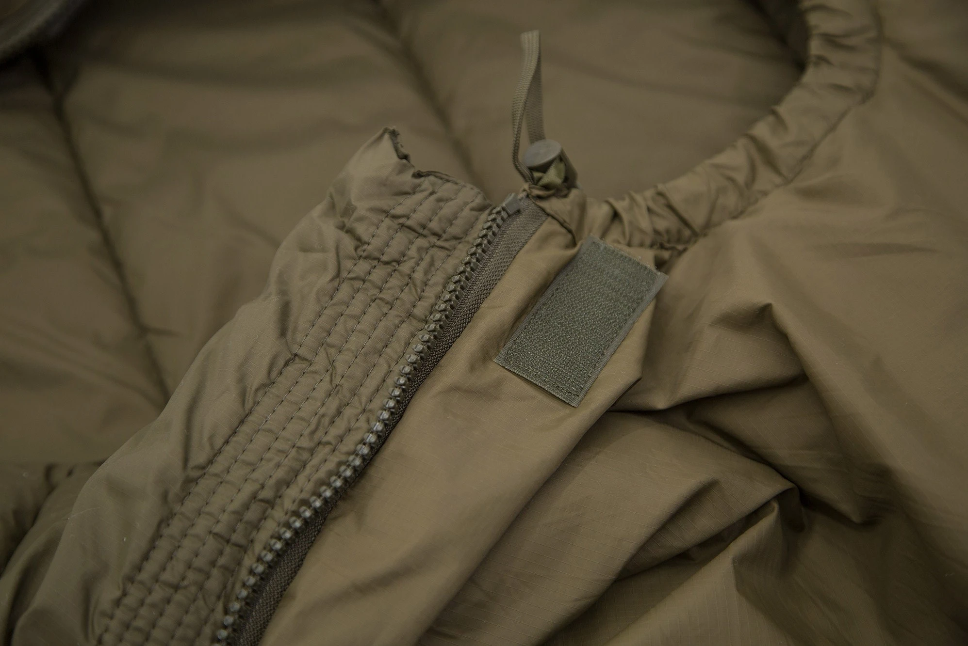 Defence 1 Top Large, som passer personlængder op til ca. 200 cm, er skåret i en rummelig mumiefacon og foret med et enkelt lag af den enestående G-Loft® -fiber, som Carinthia selv har udviklet og er blevet så berømt for. Så berømt, at mange andre store producenter (fx Fjällräven) anvender G-Loft® som deres foretrukne fiberfyld i den forede beklædning og i de dyrere soveposer. For dels er denne spundne mikrofiber af polyester fantastisk blød og behagelig, men derudover er det givetvis det fiberfyld på markedet, der binder allermest isolerende luft i forhold til fyldmængden. Dertil kommer, at det er ekstremt hydrofobisk, så Carinthias soveposer også tåler det hårde liv i de åbne shelters, hvor de til tider netop udsættes for både vind og vand.