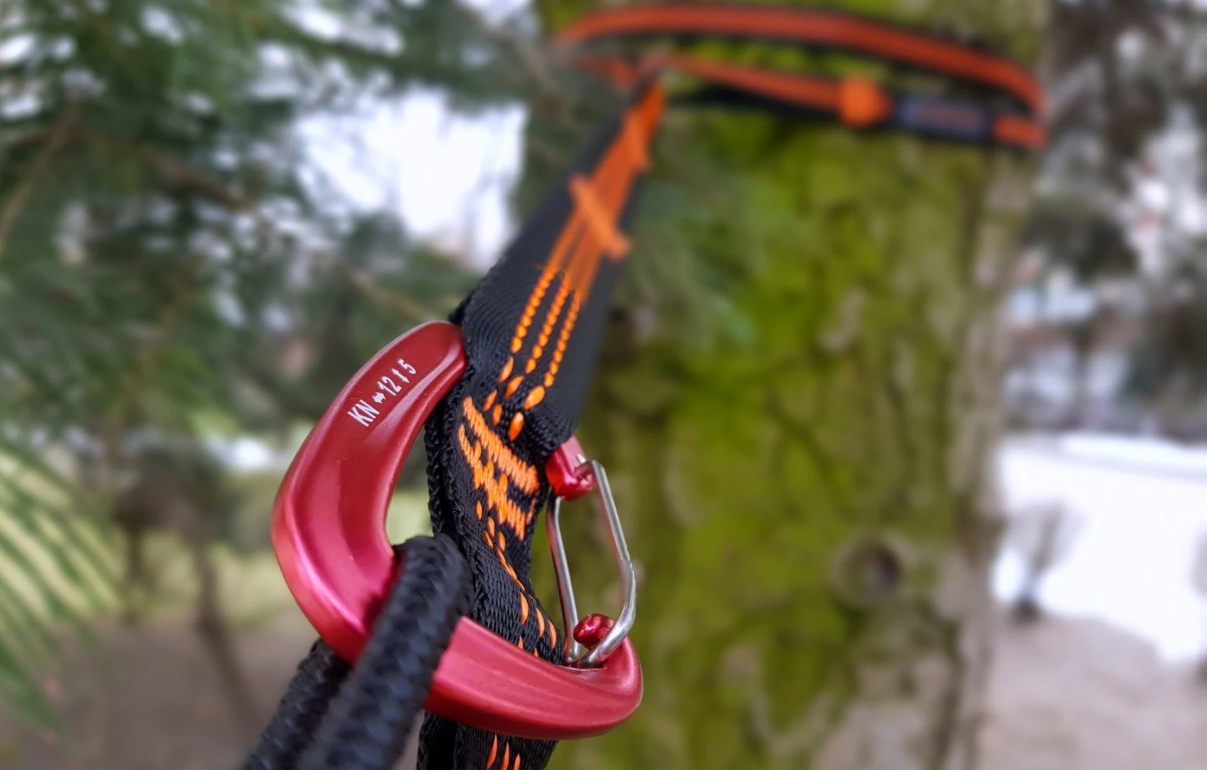 Når du har viklet remmene omkring træerne, skal du blot fastgøre din hængekøje ved hjælp af de to karabiner i de valgte løkker på remmen, så køjen ophænges i den ønskede højde og den passende opspænding.