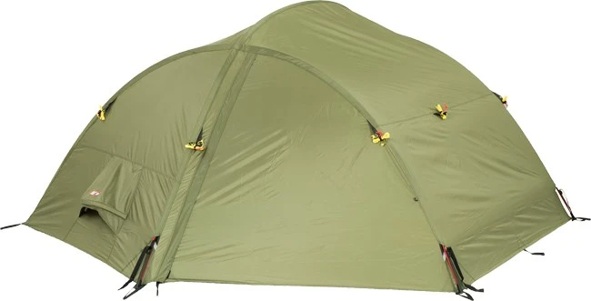 Jo, Helsport kan skam også lave andet, end tunneltelte, og et eksempel herpå er dette alsidige Reinsfjell Pro 2, som er et selvstående og meget let og rummeligt topersoners kuppeltelt, der sammenpakket fylder meget lidt i rygsækken.