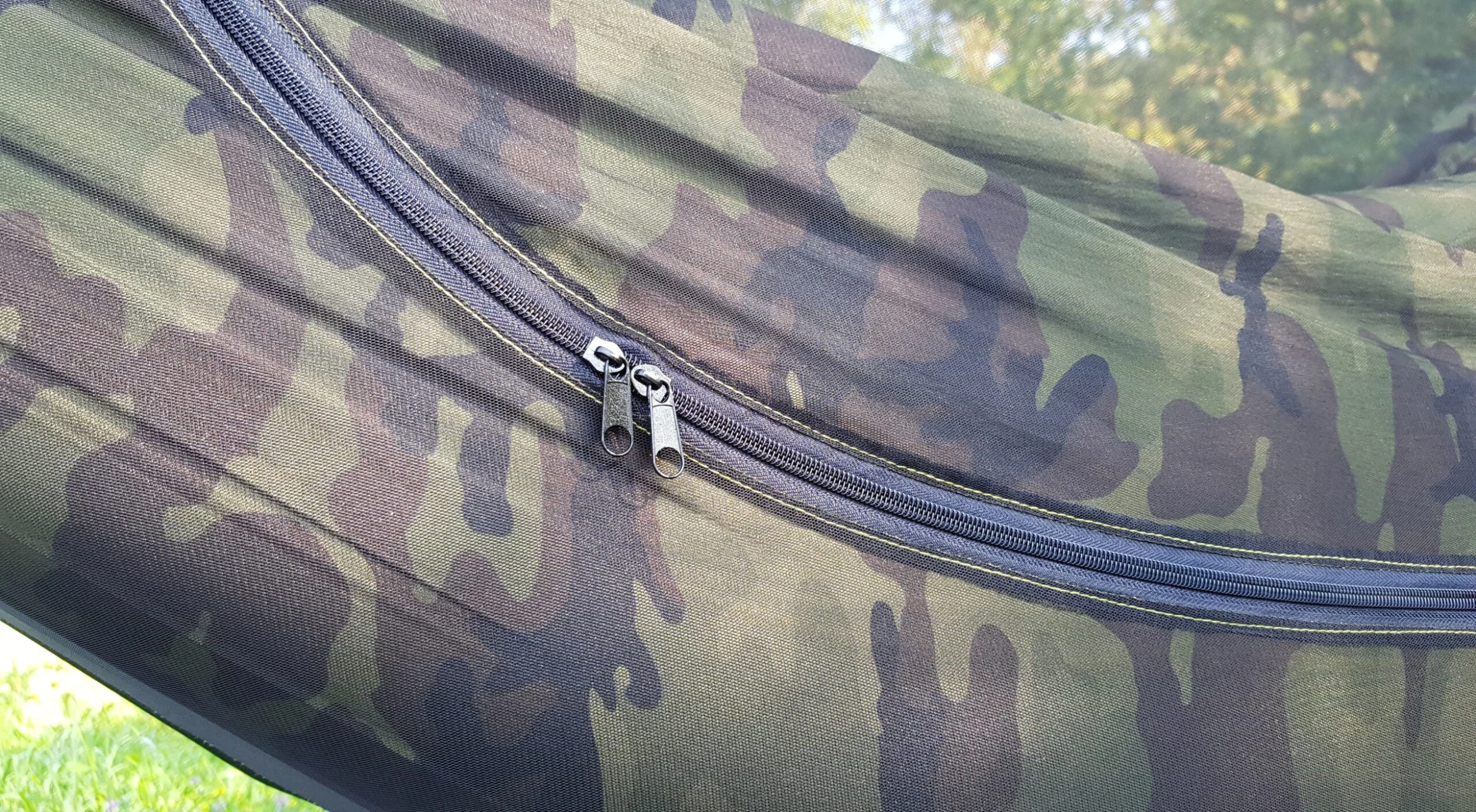 Formet som et karakteristisk smil er myggenettet forsynet med en tovejs lynlåsåbning, som gør det nemt at komme ind og ud af hængekøjen. Med denne løsning sikres det desuden, at det åbnede myggenetspanel hverken filtrer sammen eller falder ned og bliver snavset på jorden.