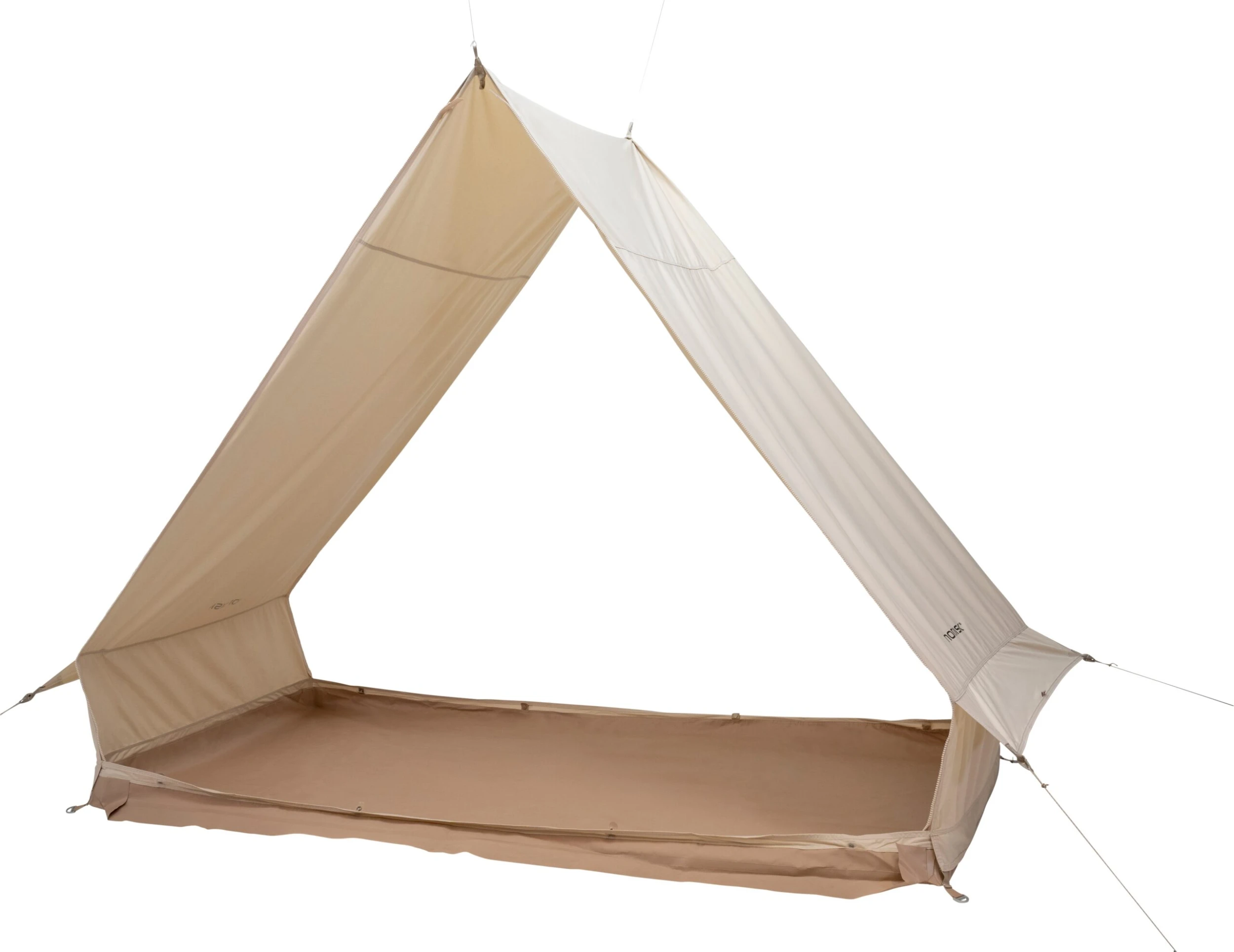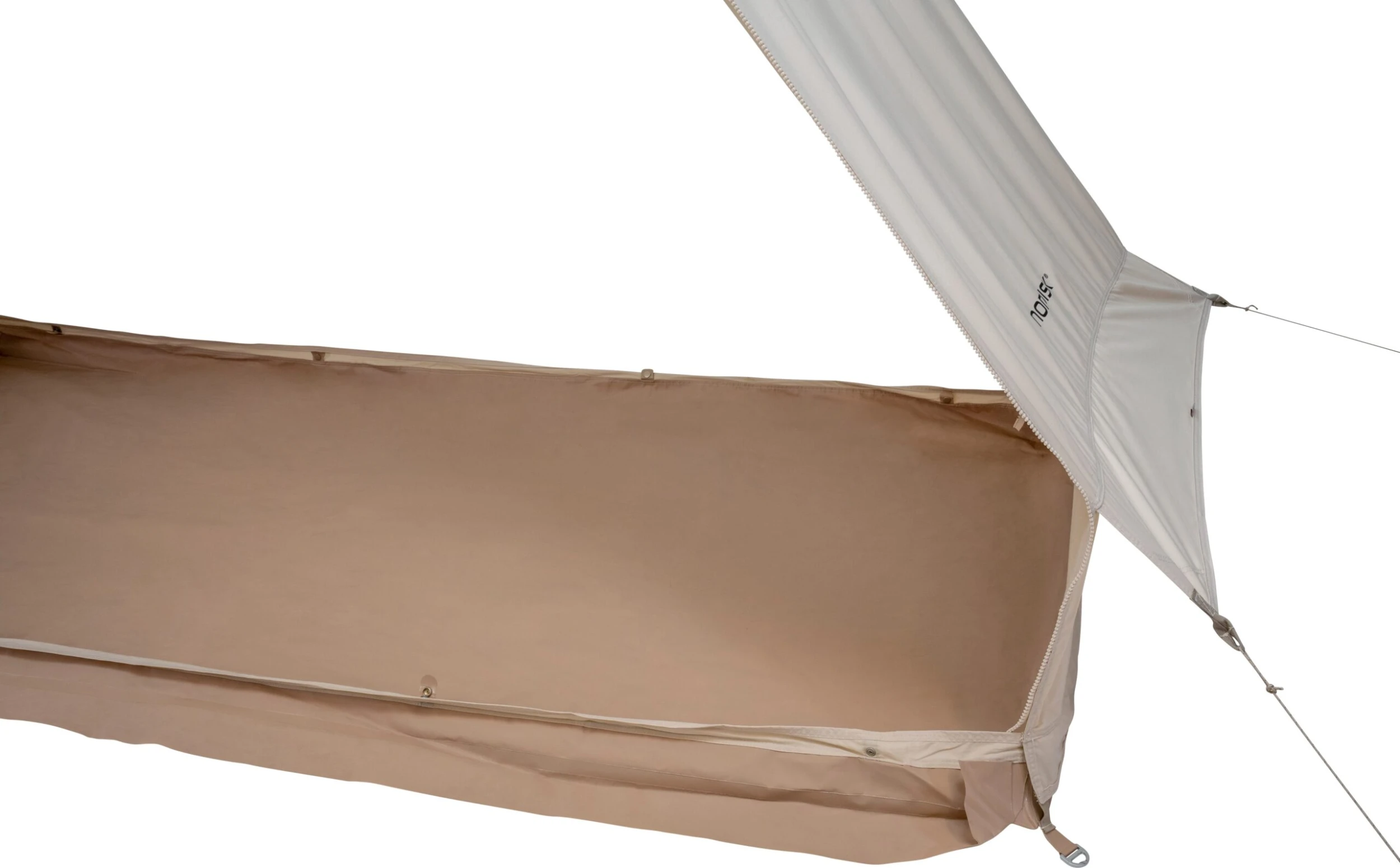 Teltdugen er naturligvis fremstillet af Technical Cotton™, som er en fantastisk bomuld/polyesterblanding, hvor alle sejl er sat ind for at komme kondensproblemerne til livs og gøre indeklimaet optimalt – også når sommerturen går mod det sydlige Europa! Og så holder dette rivstærke og på ydersiden specialbehandlede materiale samtidig forbavsende meget vand ude, da det dels er behandlet på ydersiden og da tekstilet dels har nogle nærmest fortættende egenskaber, når det bliver vådt. Men den store fordel ved denne dug er, at det giver et langt, langt bedre indeklima og minimal kondensdannelse, sammenlignet med de traditionelle telte! Desuden er metervaren mere UV / UVA-resistent end nylon og traditionelt polyester – det kan altså tåle eksponering af solens stråler i længere tid end et nylonoversejl uden at falme og mørne. Alle spidsbelastningspunkterne såsom bardun- og pløkfæste er ekstra forstærket.