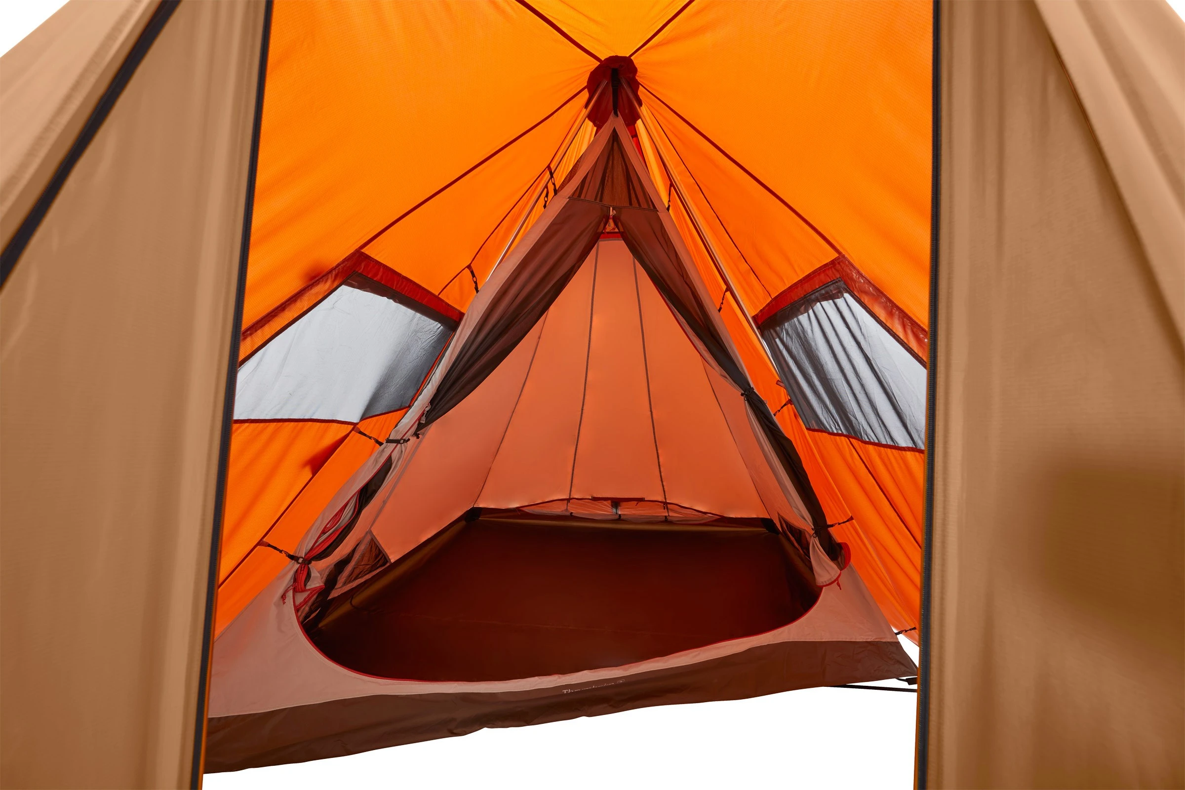 Med et par passende kæppe eller et sæt tarpstænger – som fx Thrymheim 3+5 Canopy Alu Poles, 2 pcs – kan det midterste panel ved indgangspartiet slås op og bruges som baldakin for at øge det overdækkede areal og den generelle rumfornemmelse i teltet.