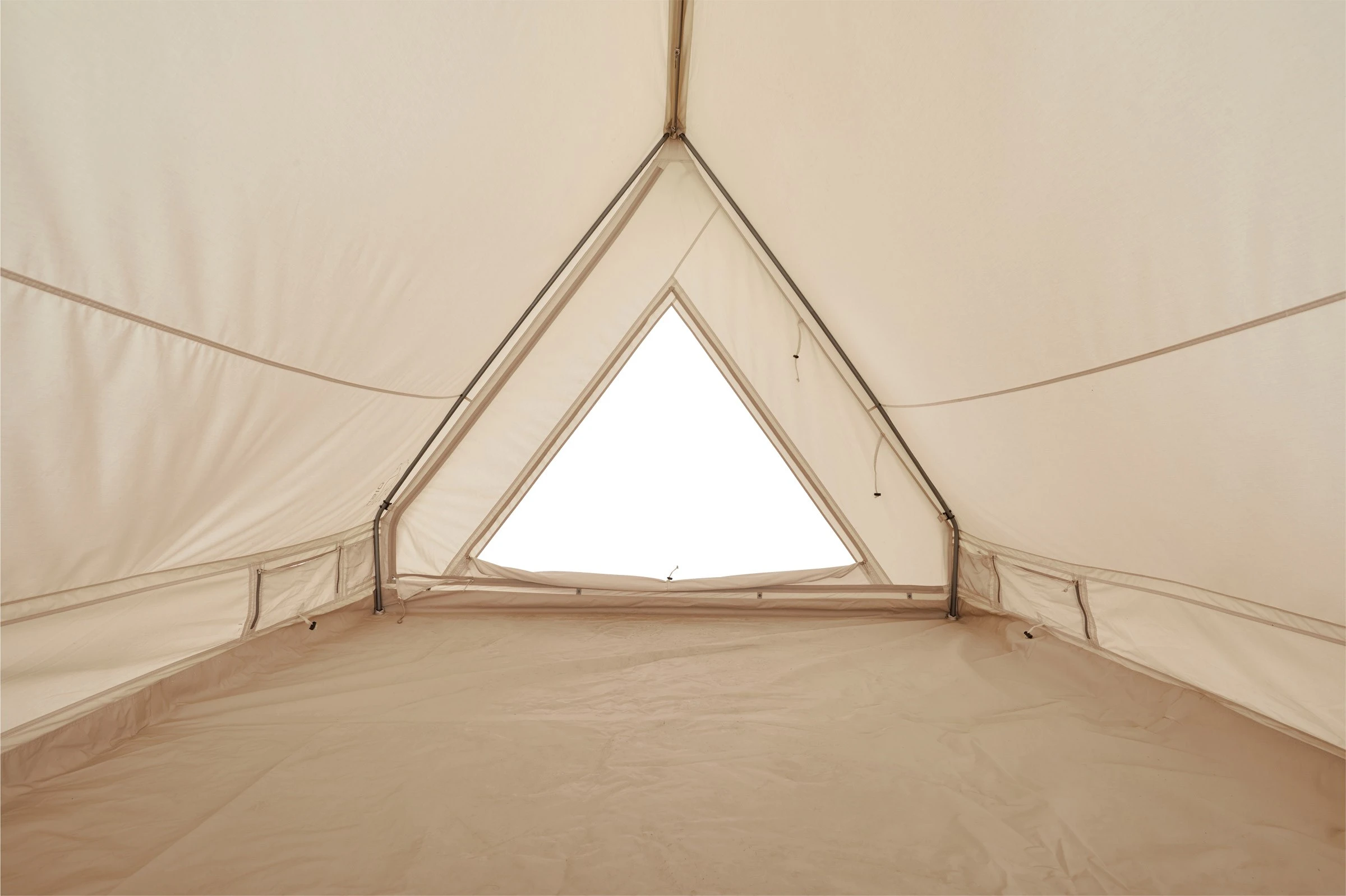 Det klassiske design, hvor der ikke bruges én eller flere separate midterstænger, men i stedet en Turtle Hub™ -konstruktion med A-stænger ved de to indgange og en tværligger imellem disse, er i sandhed noget, der øger pladsfornemmelsen indeni teltet!