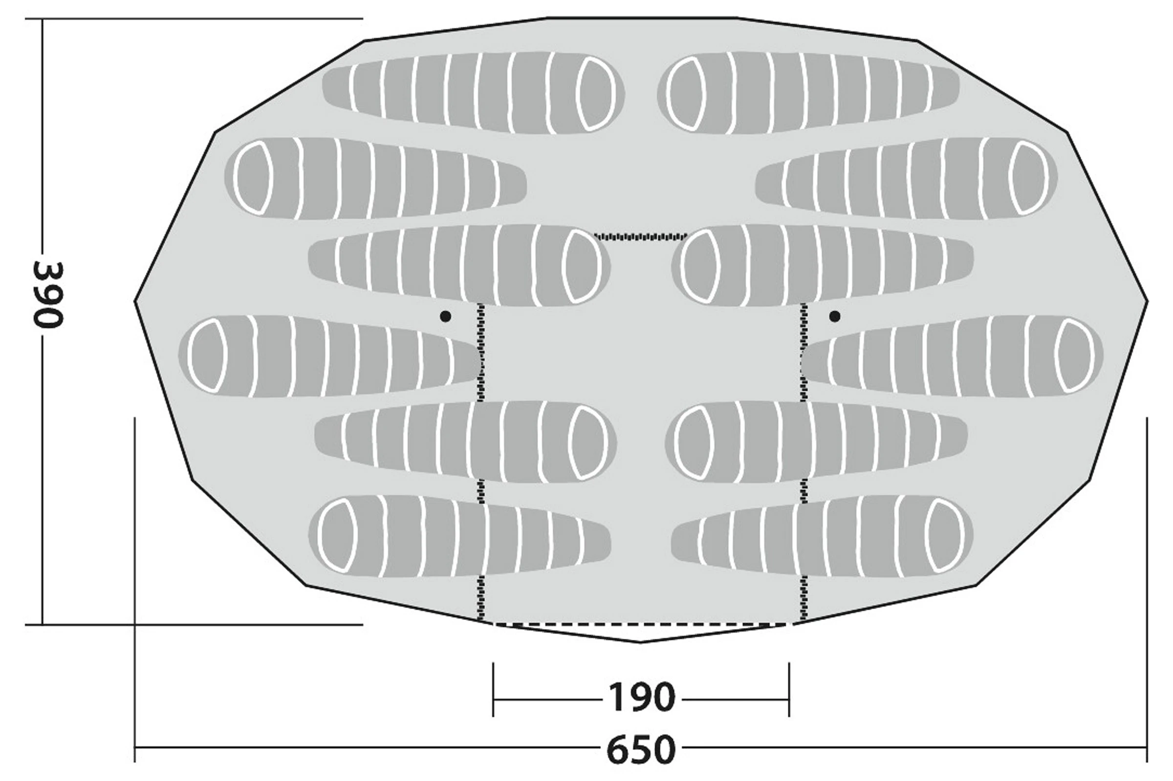 Robens Klondike 12 Twin Tipi har en bredde på 6,5 meter, en dybde på 3,9 meter og højden er hele 270 cm, så der er virkelig god plads i teltet! Teltet er nemt og hurtigt at rejse vha. af de to bærende midterstænger af anodiseret aluminium og så den afstivende bue ved indgangsdøren, der monteres efterfølgende. De regulerbare ventilskakter/vinduer nederst og de regulerbare tophatte (kaldet Internal Apex™ Air Control, som med et genialt snoretræk styres indefra) sikrer den helt rigtige luftgennemstrømning. Og så kan bardunerne på teltdugen fikst bundtes op og samles i de til formålet fastgjorte løkker, så man dels slipper for kludder i alle bardunerne, når teltet pakkes ud, og dels undgår de flagrende barduner, hvis ikke alle lige er i brug – endnu en virkelig gennemtænkt detalje!