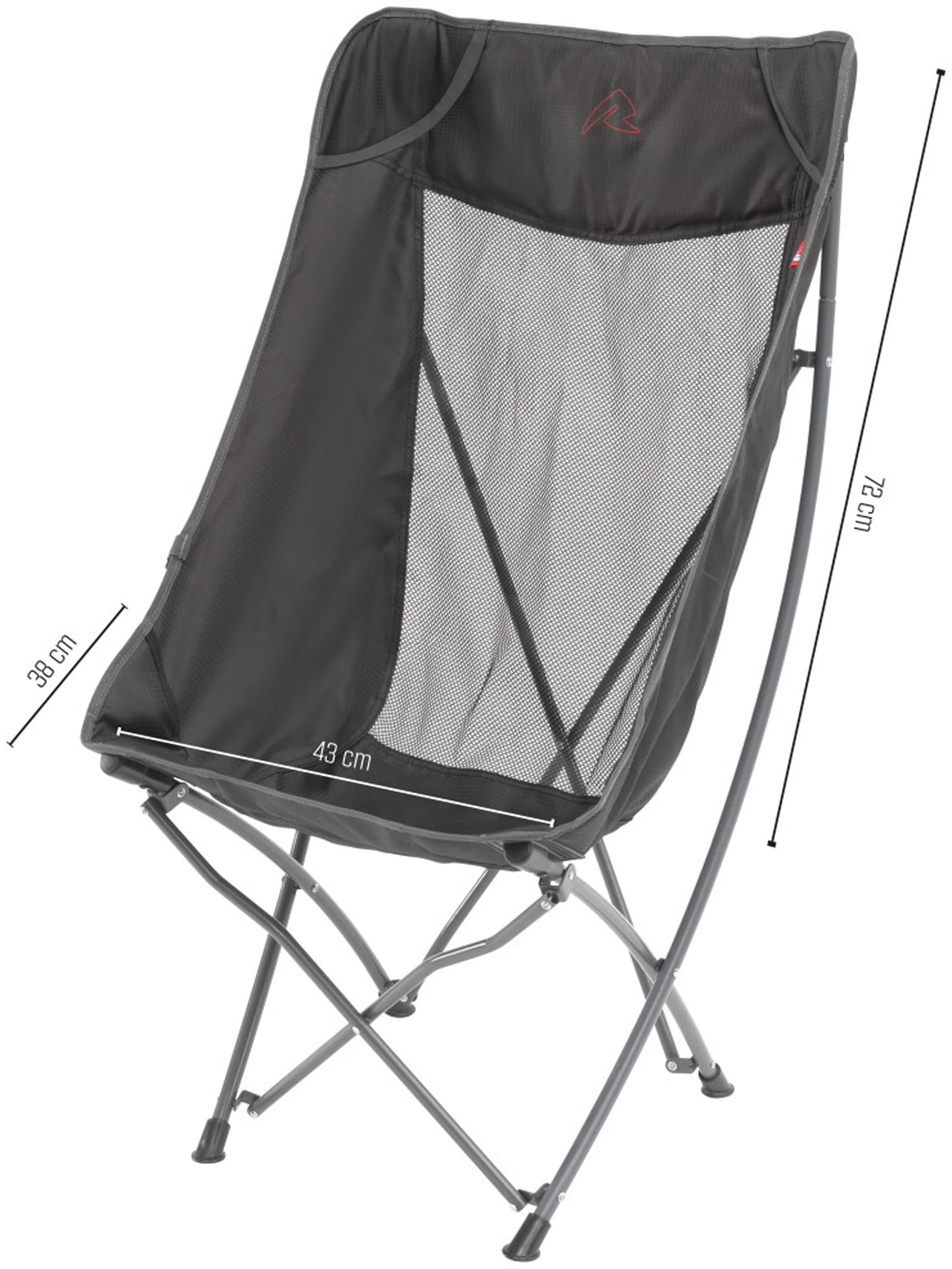 Sædehøjden er 40 cm. og udslået måler stolen 56 x 61 x 96 cm. (B x D x H), medens den sammenpakket i den medfølgende transporttaske blot fylder 110 x 12 x 13 cm.