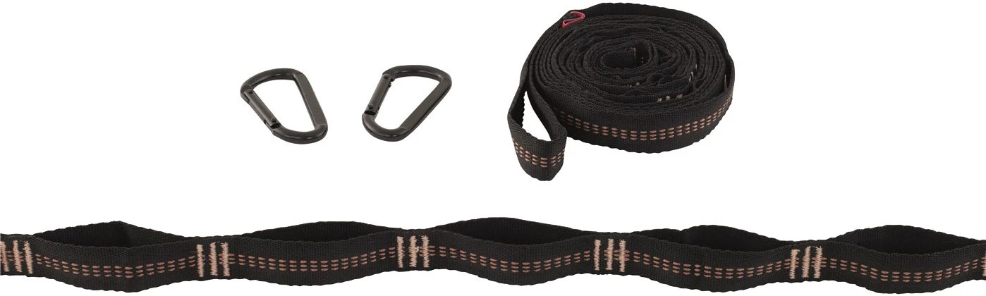 Med køjen følger som nævnt et sæt karabiner og et sæt meget stærke daisy chains, som er et par nylonstropper med flere fastsyede løkker, så længden mellem de to ophængningspunkter hurtigt kan justeres, så det passer. Du mangler bare et par træer, og så kan du lægge dig til rette.