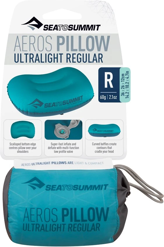 Med sine blot 60 gram er denne ultralette, superkompakte og oppustelige Aeros Ultra Light Pillow Regular fra Sea to Summit en skøn hovedpude, der er fantastisk at have med, både på alle turene i det fri, men også i bilen, i toget eller på flyrejsen.