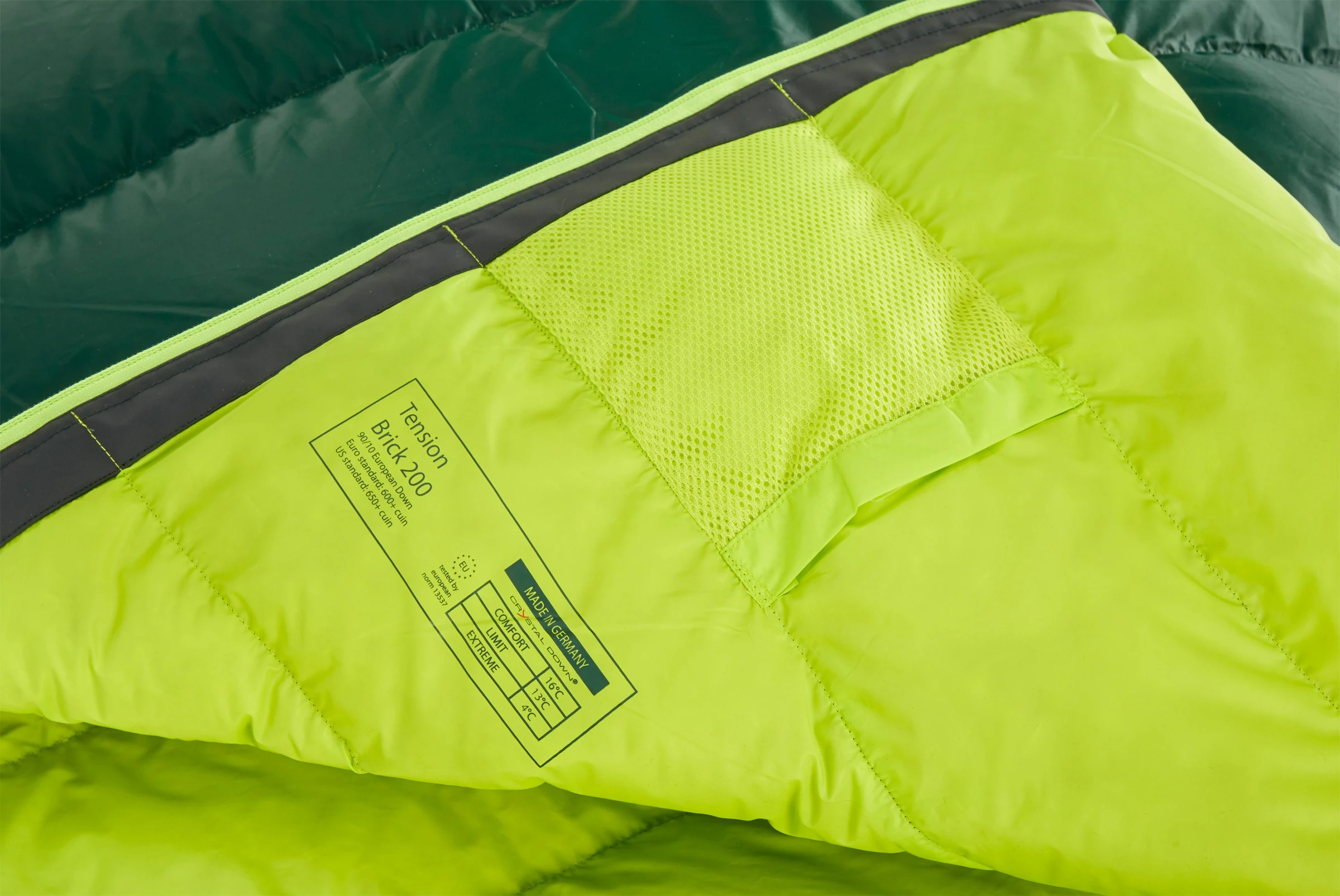 Y by Nordisk Tension Brick 200 Large er selvfølgelig udstyret med dunfyldt stormflap bag den lange lynlås (som er tovejs for at kunne ventilere nedefra) for at minimere varmetabet. Indvendig findes en fiks lomme til fx vækkeur eller værdierne. Og så leveres Tension Brick 200 Large både med pakkepose og med en stor opbevaringspose, hvori soveposen kan ligge tilpas luftigt mellem turene i det fri – det har den nemlig bedst af!